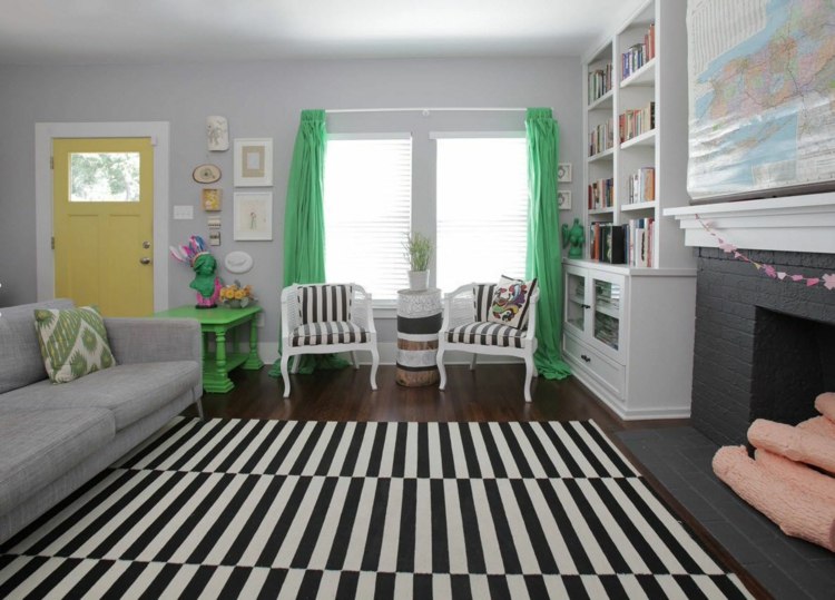 يمكن استخدام الستائر ذات اللون المخالف تمامًا لبقية الديكور، كما هو الحال هنا مع الستائر الخضراء في تلك الغرفة، وقد صارت تلك التصميمات هي الأكثر شيوعًا في السنوات الأخيرة، حيث يضيف هذا النهج لمسة لا مثيل لها لغرفة الاستقبال.