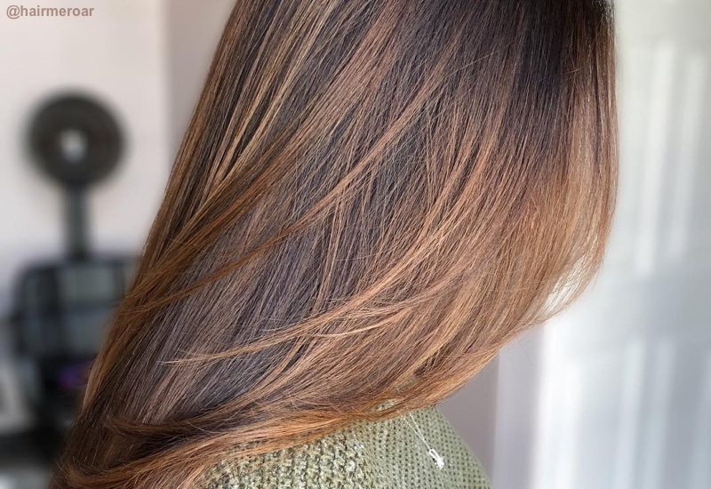 صبغ الشعر بهذا اللون الغني من خلال نهايات الخصل الداكنة الملونة بلون االقهوة ، فهي تجلب بعض الدفء للشعر الطويل والكثيف . للشعر ذو الحجم الخفيف (والحفاظ عليه سليماً طوال اليوم) يجب ان يتم الاهتمام بتوزيع اللون بشكل مدقن لتحقيق شكل شعر كثيف.