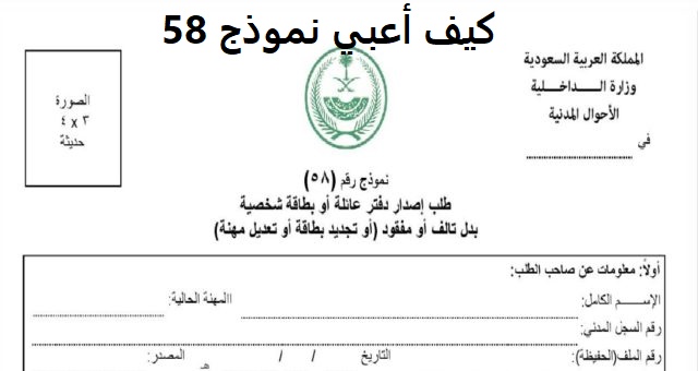 سنشرح لكم كيف اعبي نموذج 58 حيث يعد نموذج 58 للاحوال هو أحد أهم النماذج التي يتم استعمالها خلال التقديم في ملف الحصول على بطاقة الاحوال المدنية التي تعد من اهم الاشياء التي لابد أن يمتلكها المواطن في المملكة، وفيما يلي البيانات المطلوبة لكي تعبئ نموذج 58: