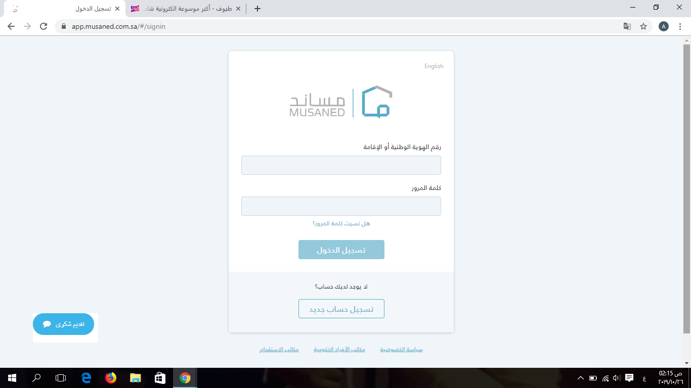 – بعد إتمامك من تسجيل حسابك في أبشر ، قم بفتح موقع مساند من خلال رابط الدخول الى مساند هنا ، و اختر كلمة تسجيل الدخول ، ستظهر لك قائمة تحتوي على رقم الهوية الوطنية أو رقم الإقامة ، و كلمة المرور ، و في أسفل القائمة ستجد إختيار حساب جديد .