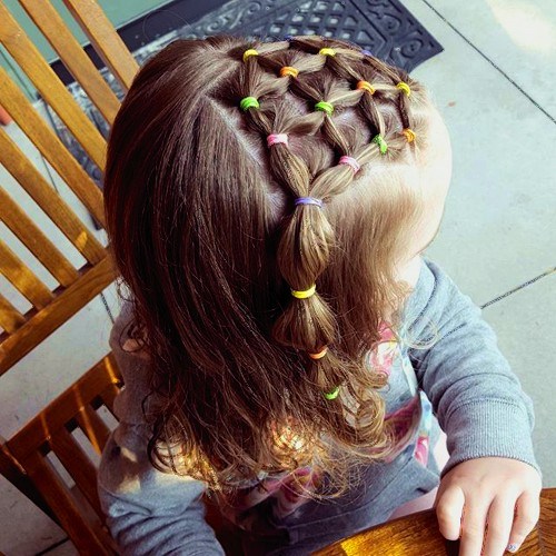 التسحات المستخدم بها اكسسوارات المطاطات الملونة هي مظهر ستستمتع به أي فتاة ابدأ بالضفائر على جانب رأس الطفلة بدلاً من المقدمة لإلقاء نظرة جديدة أخيرًا ، اجمع أطراف شعرها في كعكة فوضوية مع الضفائر .