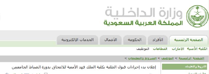 – للتسجيل في كلية الملك فهد الامنية قم بفتح موقع بوابة وزارة الداخلية من هنا، ثم انقر على اعلان كلية الملك فهد الامنية دور الضباط الجامعيين، واختر الوظائف الموجودة في الجهة اليمين.